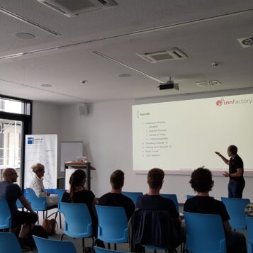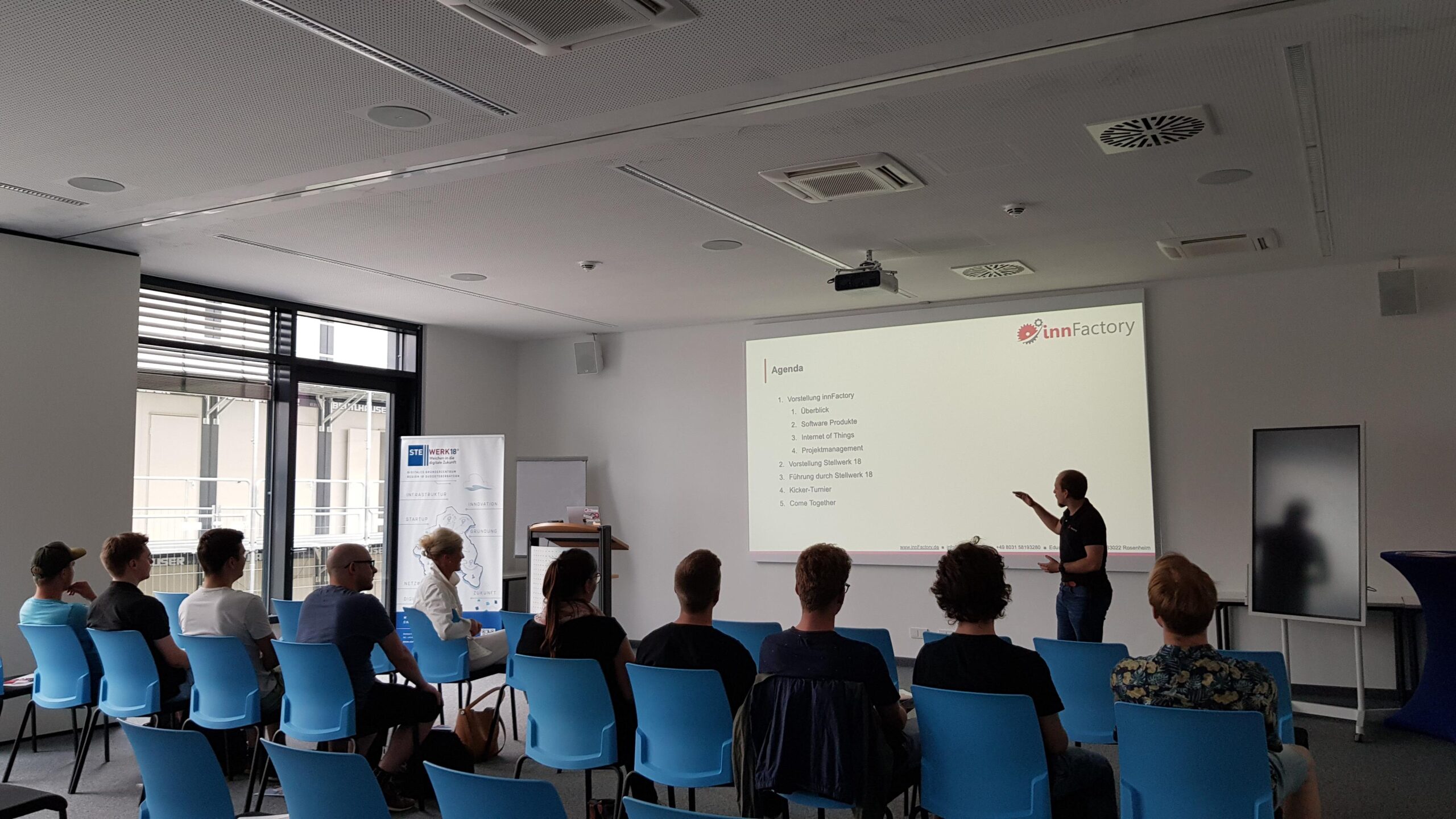 Eingeladen hatte das Stellwerk18 zusammen mit der innFactory. Nach einer kurzen Einführung in das Ökosystem Stellwerk18 durch unsere Netzwerkmanagerin Evi Bachmaier und einem Rundgang durch unser Gebäude bekamen die Studenten Einblick in die Geschäfte der innFactory durch Anton Spöck.