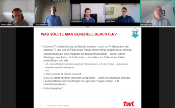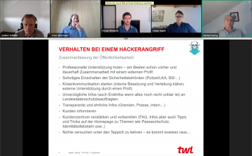 Zusammen mit der IDW und der ROSIK fand am Donnerstagabend den 18.06.21 die Online-Veranstaltung „Risiko Cyber Crime – Was tun bei einem „Hackerangriff“ statt. Nachdem zum Einstieg Franz Obermayer (Fox Group) in die aktuelle Bedrohungslage einführte, berichteten Herr Bajohr und Herr Georgi (beide Technische Werke Ludwigshafen) in einer interaktiven Veranstaltung mit anschließender Podiumsdiskussion über ihren Umgang sowie ihre Erfahrungen, Lerneffekte und Konsequenzen aus einem Hackerangriff auf ihr Unternehmen. Wir bedanken uns bei allen Teilnehmern sowie den Mitveranstaltern und Referenten IDW, ROSIK, FOX Group und Technische Werke Ludwigshafen für die gelungene Veranstaltung!